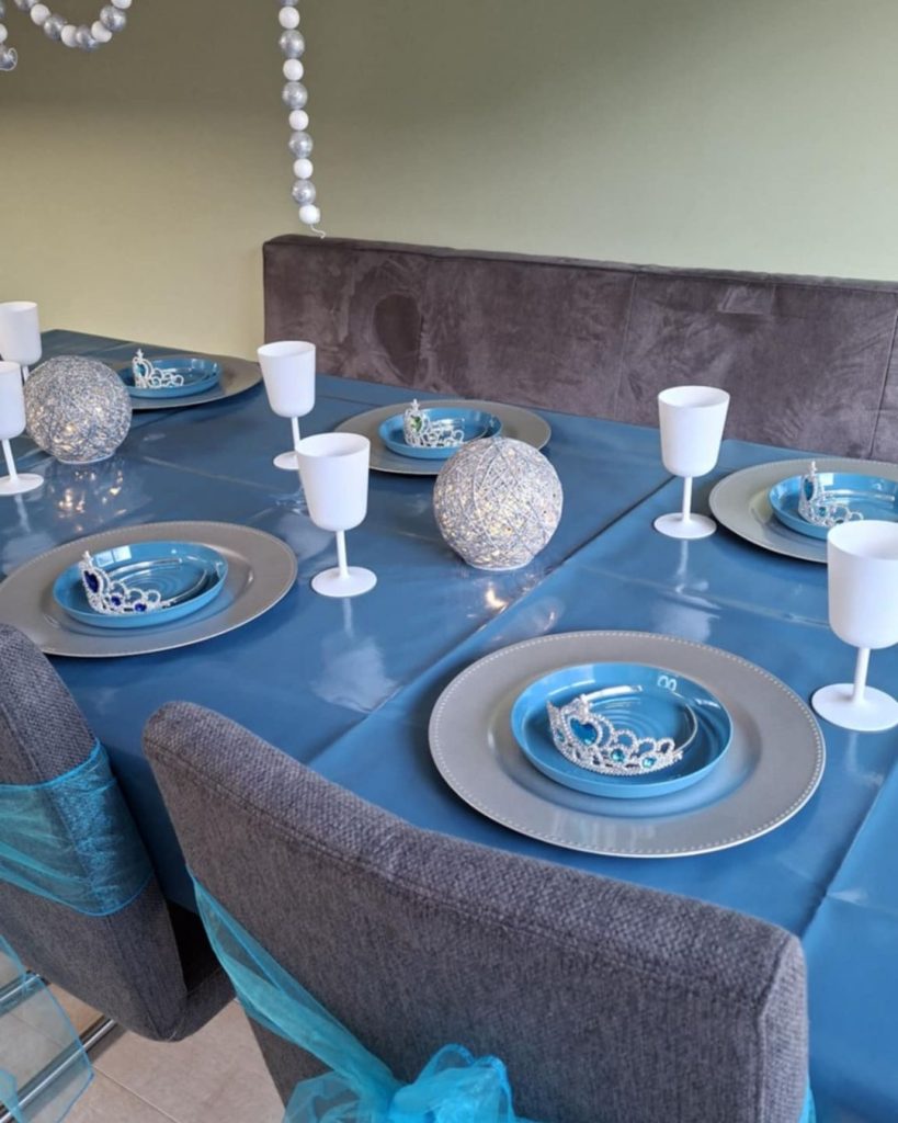 - tafelaankleding; tafelzeil, stoelstrikken, onderborden, bordjes, plastic bekers